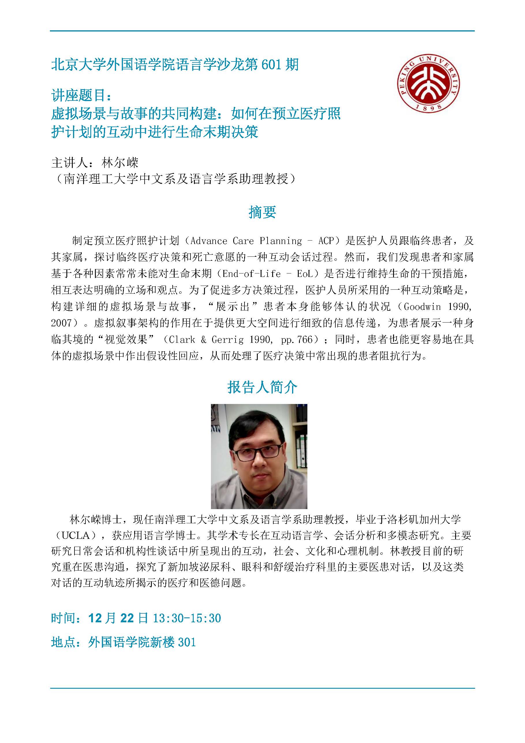 开云官方网址语言学沙龙第601期:虚拟场景与故事的共同构建:如何在预立医疗照护计划的互动中进行生命末期决策