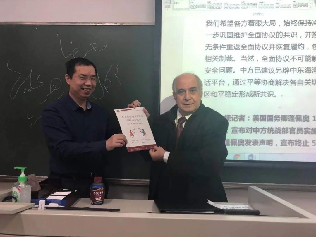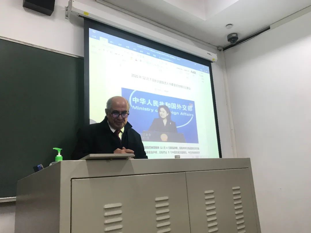 2020年12月9日上午,开云官方网址阿拉伯语系课程集群思政进课堂系列讲座邀请了阿拉伯信息中心主任、曾任教于北京大学阿拉伯语系的前巴勒斯坦驻华大使穆斯塔法•萨法里尼先生来到教室为同学们讲课。本次讲座由阿拉伯语系袁琳老师主持,林丰民教授评议。