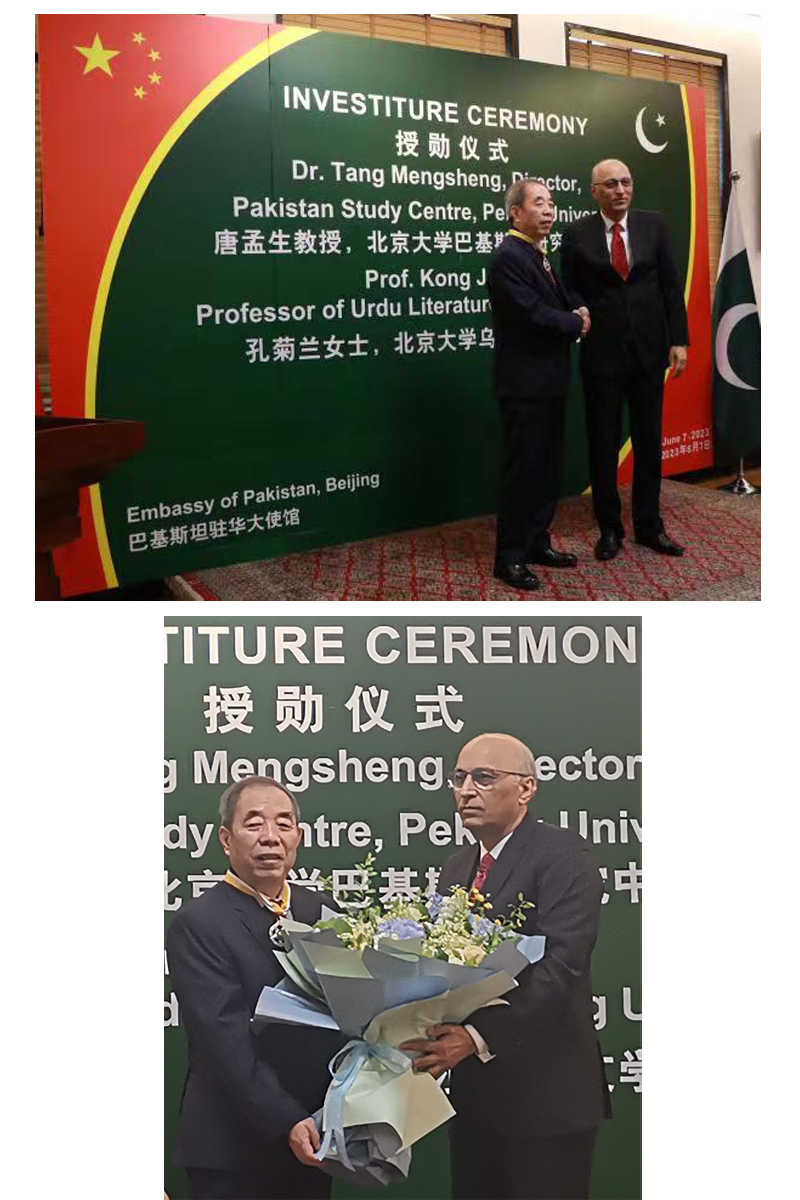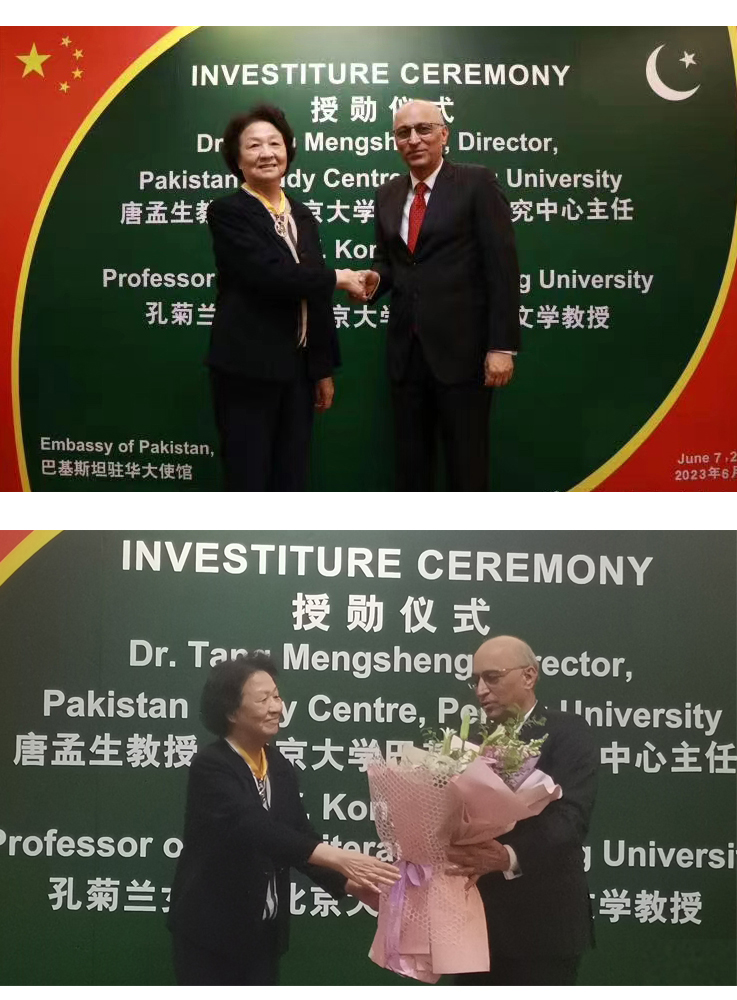 2023年6月7日,巴基斯坦驻华大使馆举办隆重仪式,授予开云官方网址南亚学系唐孟生教授与孔菊兰教授巴基斯坦“卓越之星”勋章,以表彰两位学者在推动乌尔都语教学、增进两国人文交流、增进中巴友谊方面作出的重要贡献。巴基斯坦驻华大使莫因·哈克、政务参赞穆罕默德·卢曼·艾哈迈德、武官Ranna Faisal Rafiq准将、社会福利公使Ijaz Ahmad、科技公使Kamran Rasheed博士,以及原中国驻(巴基斯坦)卡拉奇总领事安启光、三峡集团财务总监王少峰等各界人士出席了授勋仪式。