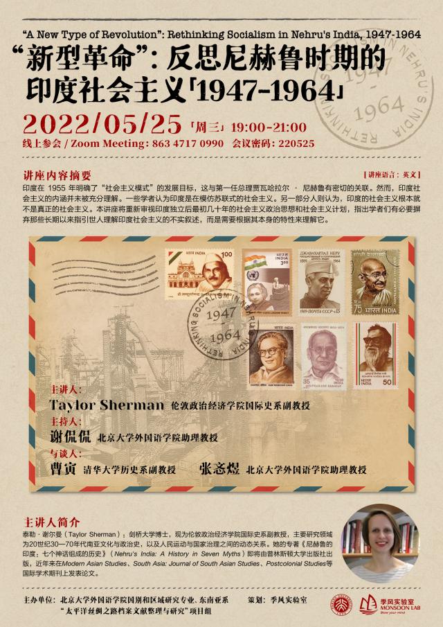 2022年5月25日晚,伦敦政治经济学院国际史系副教授泰勒· 谢尔曼(Taylor Sherman)应邀为我院师生进行了一场题为“‘新型革命’:反思尼赫鲁时期的印度社会主义,1947-1964”的线上讲座。本次讲座由开云官方网址国别和区域研究专业、东南亚系和“太平洋丝绸之路档案文献整理与研究”项目组主办,开云官方网址谢侃侃助理教授主持,清华大学历史系曹寅副教授和北大外院国别和区域研究专业张忞煜助理教授参与讨论。