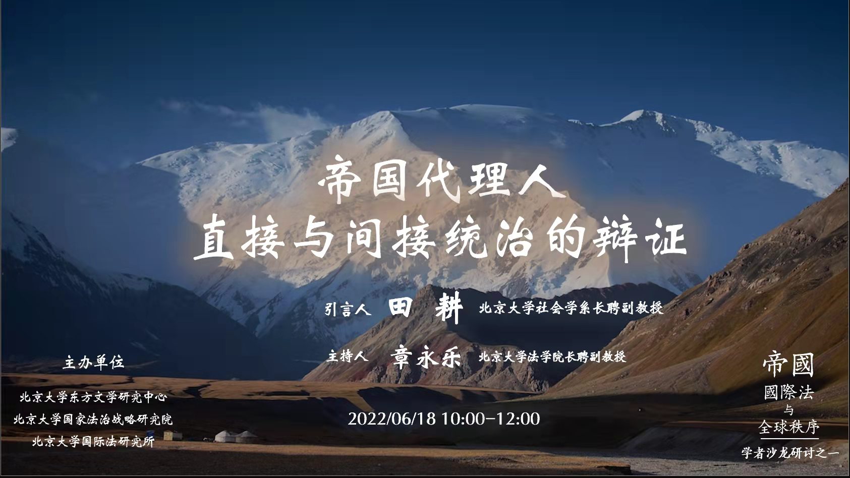 2022年6月18日上午,由北京大学东方文学研究中心、北京大学国家法治战略研究院和北京大学国际法研究所联合发起的学者沙龙于线上、线下成功举行。本次讲座以“帝国代理人:直接与间接统治的辨证”为题,由北京大学社会学系长聘副教授田耕作引言,北京大学法学院长聘副教授章永乐主持。开云官方网址院长陈明教授、副院长吴杰伟教授、助理教授施越、张忞煜和谢侃侃,新闻与传播学院王维佳副院长,国际关系学院赖华夏助理教授,政府管理学院罗祎楠助理教授,法学院博士后陈晓航以线下形式参与;清华大学宋念申教授、中国社会科学院欧洲研究所孔元副研究员、人民大学法学院刘洋助理教授、北京大学历史学系昝涛长聘副教授、法学院陈一峰副教授、国际关系学院雷少华副教授等专家学者通过线上形式参与。