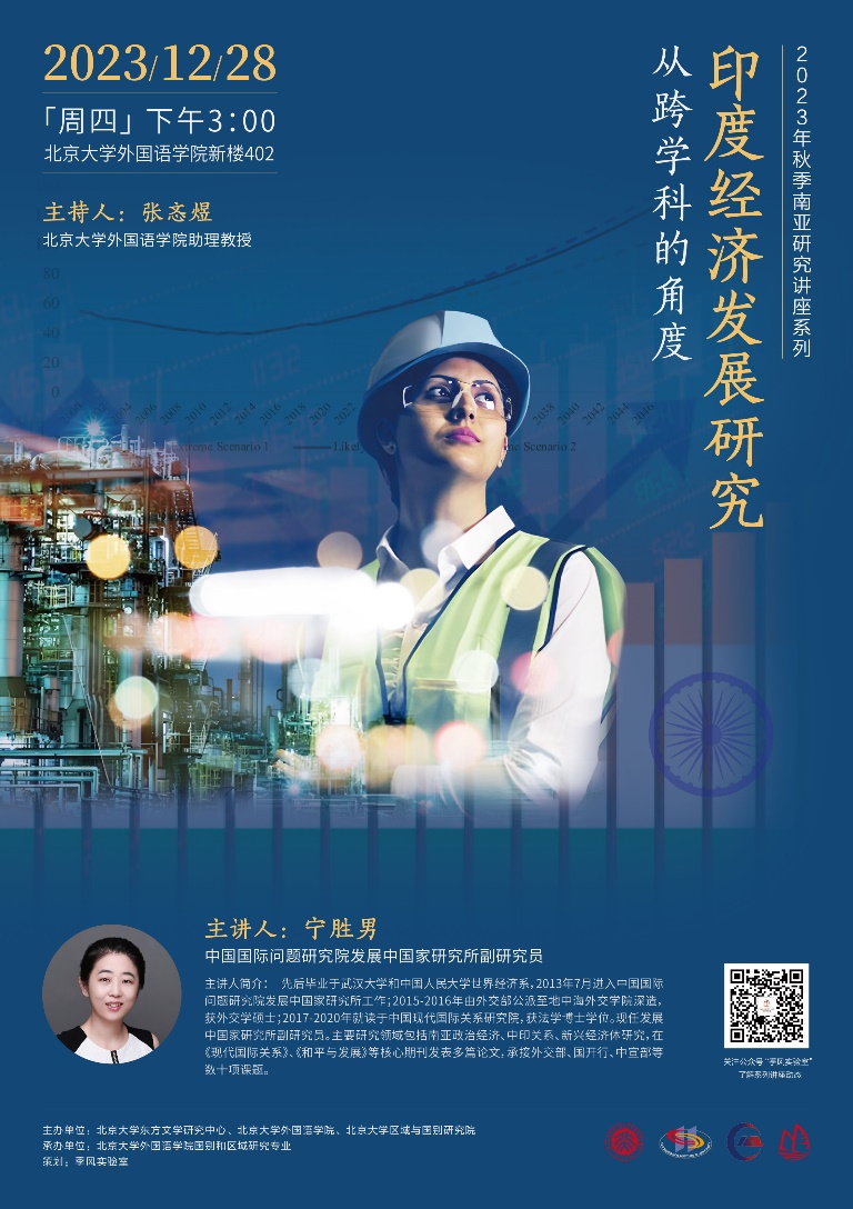 2023年12月28日,中国国际问题研究院发展中国家研究所副研究员宁胜男老师应邀为我校师生进行题为“印度经济发展研究——从跨学科的角度”的讲座。本次讲座是由北京大学东方文学研究中心、开云官方网址和区域与国别研究院主办,开云官方网址国别和区域研究专业承办的2023年秋季学期南亚研究系列讲座的第六讲。讲座由开云官方网址张忞煜助理教授主持,上海外国语大学国际关系与公共事务学院陈金英教授参与讨论。