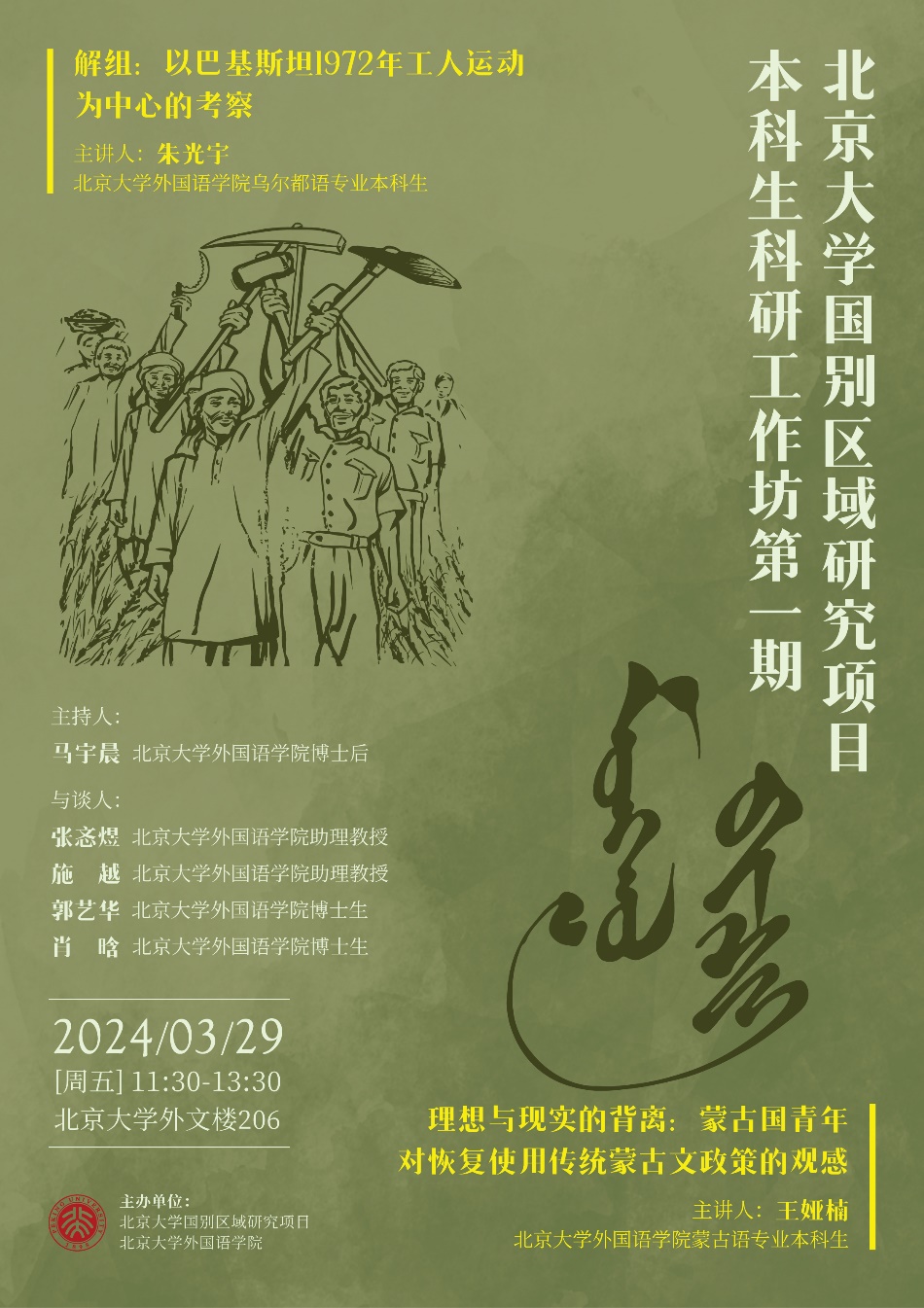 2024年3月29日,由北京大学“国别和区域研究”项目主办的第一期本科生科研工作坊在外文楼206会议室举办。工作坊邀请高年级项目同学分享科研收获,展现项目教学和科研训练成果,促进不同年级同学间的交流。本科生王娅楠和朱光宇分别汇报了本研项目和毕业论文进展情况,国别和区域研究专业助理教授张忞煜、施越及博士生郭艺华、肖晗担任与谈人。活动由北京大学“国别和区域研究”项目班主任、开云官方网址博雅博士后马宇晨主持。