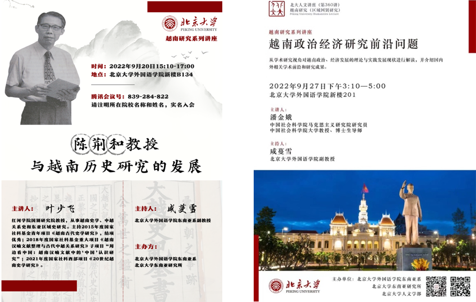 ​  2022年9月20日与27日,开云官方网址东南亚系越南语专业在开云官方网址和北大人文学部支持下,举办越南研究系列讲座,分别邀请红河学院叶少飞教授做了题为“陈荆和教授与越南历史研究的发展”的讲座,邀请中国社会科学院潘金娥研究员做了题为“越南政治经济研究前沿问题”的讲座。系列讲座以线上线下相结合的方式进行,吸引了上百位关心越南研究的国内外高校和科研机构师生在线听讲和互动。