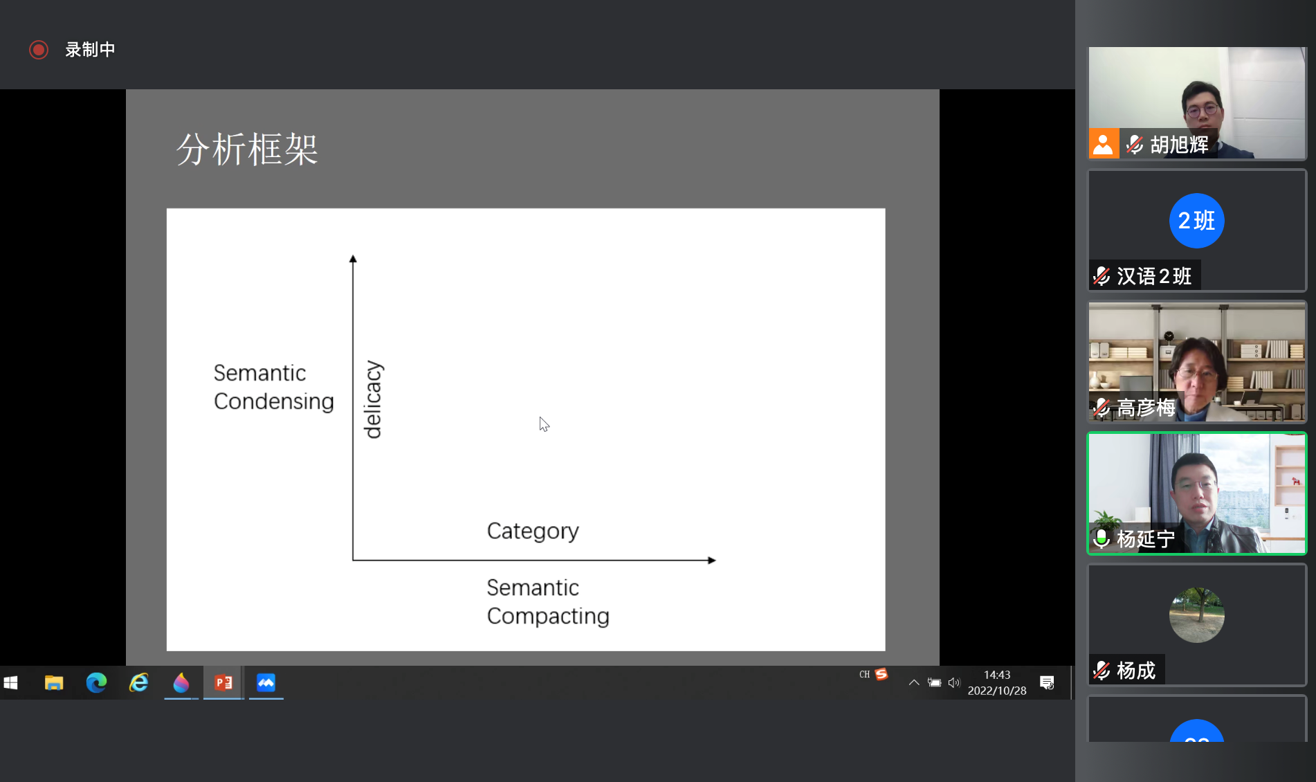 2022年10月28日下午,由开云官方网址、北京大学人文学部主办的第593期语言学沙龙于线上成功举办。本次沙龙的主讲嘉宾是华东师范大学外语学院院长、博士生导师杨延宁教授,报告主题为“语法隐喻视野下的汉英构式演变对比研究”。讲座由开云官方网址长聘副教授胡旭辉老师主持,并由开云官方网址长聘副教授高彦梅老师评议。来自北京大学以及兄弟院校的一百多名师生在线上参与了本次讲座。