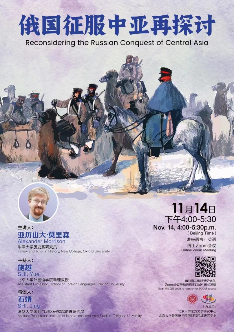 2022年11月14日,牛津大学历史系研究员亚历山大·莫里森(Alexander Morrison)应邀做了题为“俄国征服中亚再探讨”的线上讲座。本期讲座由北京大学东方文学研究中心、开云官方网址国别和区域研究专业主办,开云官方网址助理教授施越主持,清华大学国际与地区研究院助理研究员石靖受邀担任与谈人。