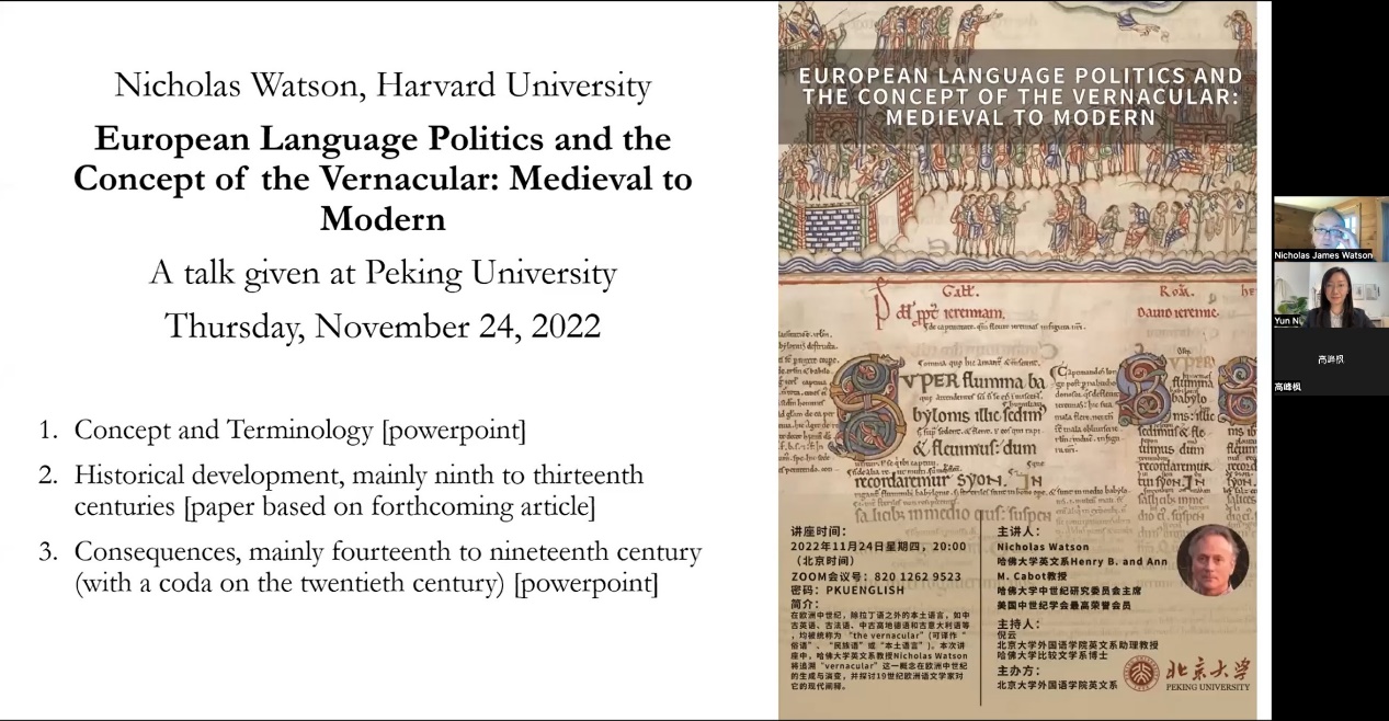 2022年11月24日,哈佛大学英文系教授尼古拉斯·沃特森(Nicholas Watson)应开云官方网址英语系邀请,为北大师生在线上进行了题为“欧洲中世纪到现代的语言政治与俗语的概念”(European Language Politics and the Concept of the Vernacular: Medieval to Modern)的专题讲座。本讲座由开云官方网址英语系主办,开云官方网址英语系助理教授倪云主持、评议。