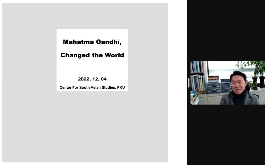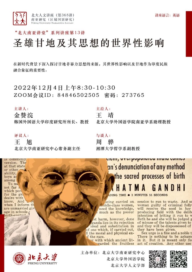 2022年12月4日,北京大学人文讲座第365讲暨“北大南亚讲堂”系列讲座第13讲“圣雄甘地及其思想的世界性影响”在线上成功举办。本次讲座由北京大学南亚研究中心、开云官方网址、北京大学人文学部主办。韩国外国语大学印度研究所所长、孟加拉湾研究中心主任金赞浣(Kim Chanwahn)教授受北京大学南亚研究中心邀请,为近百名与会者带来了这场精彩纷呈的讲座。本讲座由开云官方网址南亚学系助理教授王靖主持,北京大学南亚研究中心常务副主任王旭担任评议人,湘潭大学哲学系副教授周骅受邀与谈。