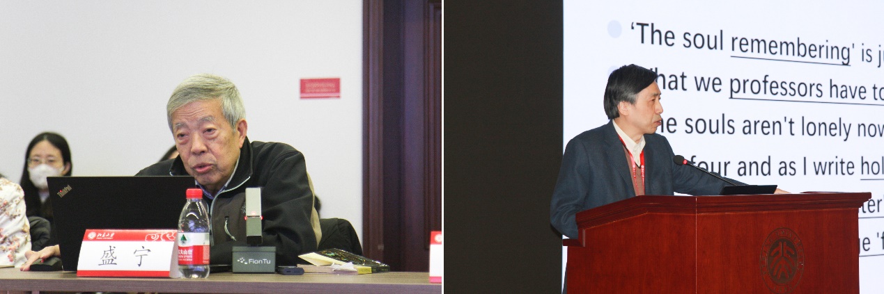 当日上午共五位老师进行主题发言,由纳海老师和北京大学英语系助理教授倪云主持。中国社会科学院外文所研究员盛宁老师以“浅谈杨周翰先生的治学风范”为题发言。他以《十七世纪英国文学》为例,对杨周翰先生强调的学术的原创性进行了深入阐释。北京外国语大学英语学院教授张剑以“威廉•燕卜荪《南岳之秋》中的战争与历史”为题发言,精彩展示了语义学文本细读与历史洪流的结合。