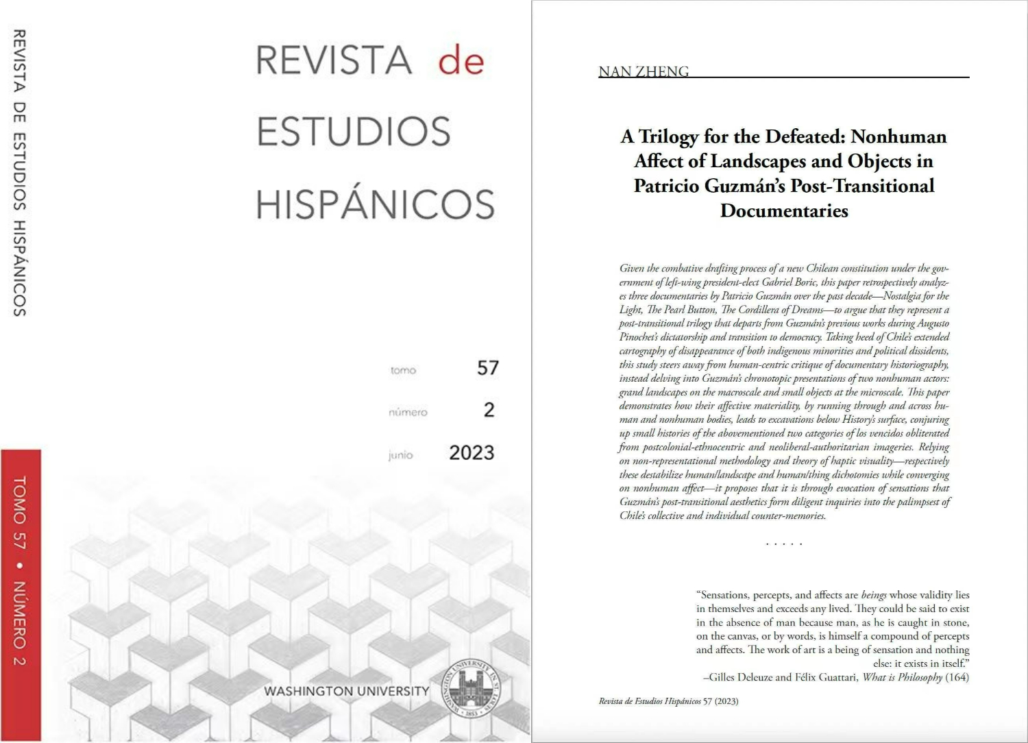 开云官方网址西葡意语系助理教授郑楠作为唯一作者的学术研究型论文《献给战败者的三部曲:帕特里西奥·古斯曼民主过渡后纪录片中风景与物件的非人类情动》(“A Trilogy for the Defeated: Nonhuman Affect of Landscapes and Objects in Patricio Guzmán’s Post-Transitional Documentaries”),近期在A&HCI来源期刊《西班牙语世界研究期刊》( Revista de Estudios Hispánicos )2023年第2期刊登。《西班牙语世界研究期刊》由美国圣路易斯华盛顿大学罗曼语语言文学系主办,采用严格的多轮匿名审稿制度,刊登西班牙语国家和地区文学和文化研究、电影研究和文艺理论批评研究等方向的西班牙语或英语学术论文。该期刊现位列JCR期刊引证报告罗曼语文学研究类一区,是国际学术研究界公认的权威期刊。郑楠老师的论文是该期刊自1967年创刊以来中国学者的首次发表,也是国际权威学术期刊第一篇整体研析古斯曼纪录片三部曲并尝试命名的学术研究型论文。