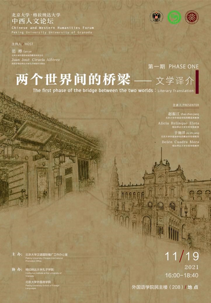 2021年11月19日,由北京大学汉语国际推广工作办公室主办(以下简称汉推办),西班牙格拉纳达大学孔子学院与开云官方网址协办的首期“中西人文论坛”在民主楼208会议室成功举办。本期论坛以“文学译介-两个世界间的桥梁”为主题,邀请来自开云官方网址西葡意语系教授赵振江、系主任范晔、副系主任于施洋,格拉纳达大学文哲学院教授、汉学家雷林克(Alicia Relinque Eleta)、西班牙中国文学作品新生代译者代表白兰(Belén Cuadra Mora),格拉纳达大学孔子学院外方院长胡安·何塞·西鲁埃拉(Juan José Ciruela)为国内外通过网络连线论坛的百余名师生带来精彩的讲座。本次论坛由范晔与胡安共同主持。