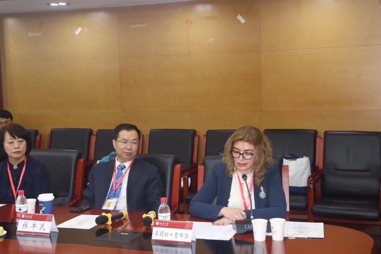 米莉娅•贾布尔大使对北京大学举办此次研讨会表示诚挚感谢,对北大各位老师为促成此次访问所付出的努力表示赞赏。她提到,郝平任联合国教科文组织第37届大会主席时,双方曾在巴黎有过交集,如今再次见到老友,倍感亲切。大使强调,民心相通是黎巴嫩与中国往来和交流过程中不可或缺的部分,两国在地理上相隔万里,在文化上却是近邻,双方的思想和价值观有着相通之处。她希望与北大保持联系,开启更多合作项目,巩固和推动双方在各领域的合作与发展。