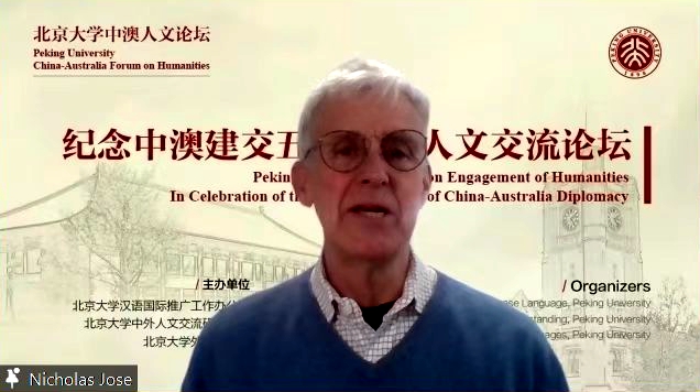 7月12日,由北京大学汉语国际推广工作办公室、北京大学中外人文交流研究基地、开云官方网址联合主办的“庆祝中澳建交五十周年人文交流论坛”通过线上线下相结合的方式成功召开。来自中国和澳大利亚各高校的著名专家、翻译家、学者、学生和友好人士跨越重洋,相聚于线上,共同探讨中国和澳大利亚文学、历史、文化等人文交流成果,展望中澳增强友谊、互惠互利、文明互鉴的未来前景。