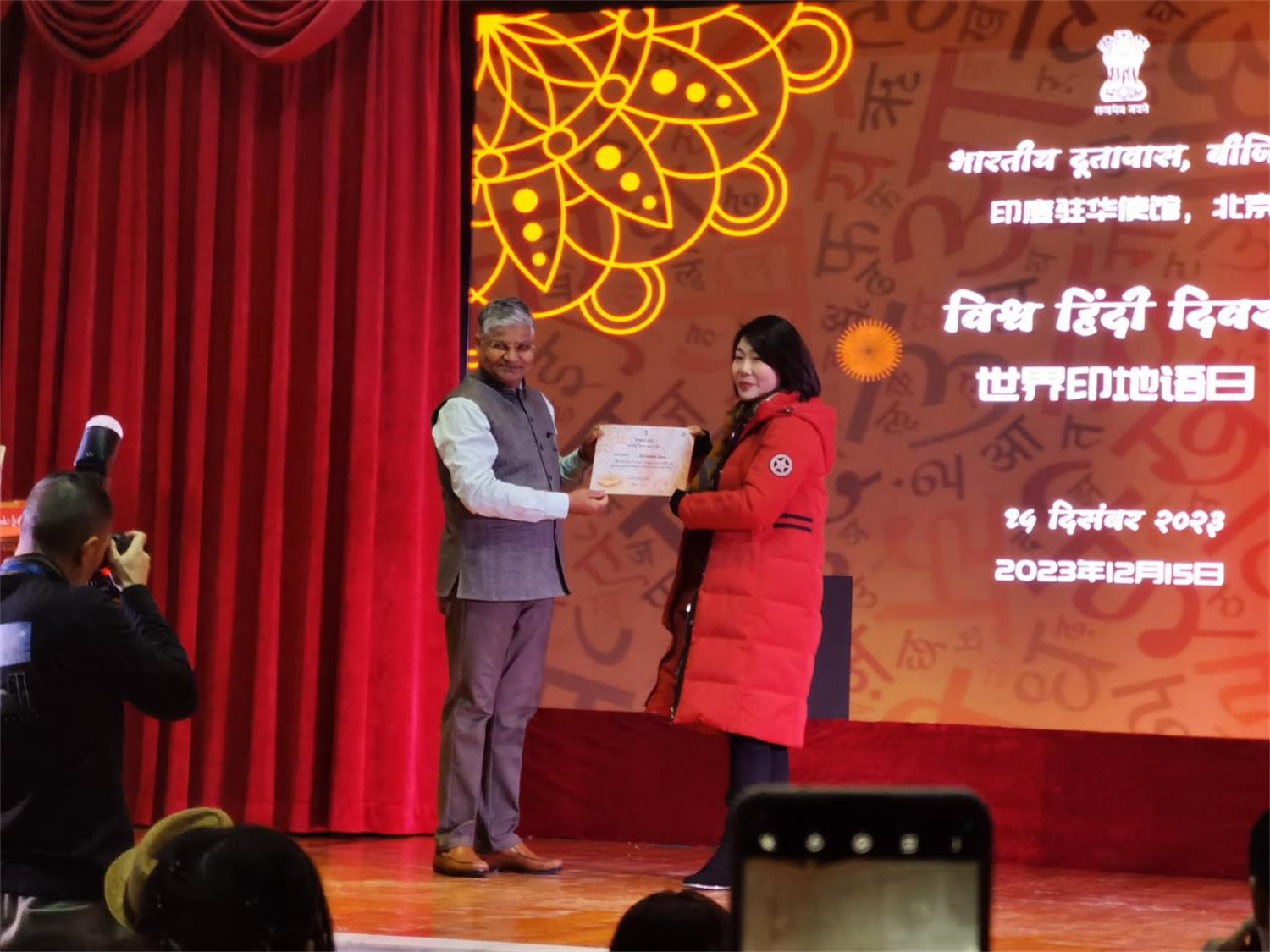 庆祝活动在印度驻华大使罗国栋(Pradeep Kumar Rawat)先生及学界前辈的致辞中拉开帷幕。庆祝活动包括“印地语诗歌朗诵比赛”和“印地语节目展演”等环节,来自北京大学、清华大学、北京外国语大学、中国传媒大学、北京第二开云官方网址等高校师生和中国国际广播电台国际在线印地语部记者以及在京印度留学生参加该庆祝活动。我院南亚学系印地语专业师生在活动中表现优异,取得佳绩:2021级印地语专业本科生李依诺在“印地语诗歌朗诵比赛”中获最佳表现奖,2021级和2023级印地语本科生的积极展演获得赞誉,我院印地语专业喜获“优秀组织奖”,印地语专业教师代表王靖、贾岩获“优秀指导奖”。