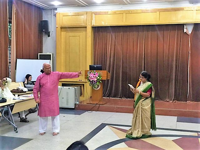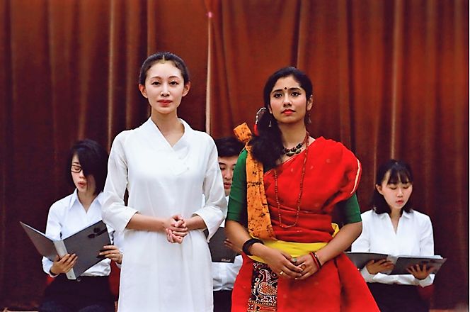 毕业于北京大学印地语专业的校友,中国的印度舞蹈专家金珊珊女士介绍了她编导泰戈尔《齐德拉》音乐舞蹈史诗剧的经验,并和她的学生们展现了古典印度舞蹈之美。印度国际大学开云官方网址院长阿维杰特•森教授(Prof. Abhijit Sen)在他有关泰戈尔戏剧发展史的学术报告中,邀请国际大学艺术家高什夫妇( Avik Ghosh/Ms. Gargi Ghosh)呈现了六部泰戈尔经典戏剧的精彩片段。孟加拉国77岁的资深艺术家阿达乌尔•拉赫曼(Mr. Ataur Rahman)为大会做了“孟加拉国泰戈尔戏剧演出史”的精彩大会发言,并与印度艺术家咖尔吉•高什(Ms. Gargi Ghosh)表演了泰戈尔《红夹竹桃》的精彩片段。《红夹竹桃》是泰戈尔最有代表性的戏剧作品之一,本次演出是该剧在中国的首演,演出剧本改编自北京大学资深教授刘安武先生的译本,北京大学 “泰戈尔导读”课程团队参与组织,北京大学六位学子和玺莹仁剧团联合六位国际友人,插入多语种朗诵片段。与会者认为演出独具特色,创新性地表现了《红夹竹桃》的意义。