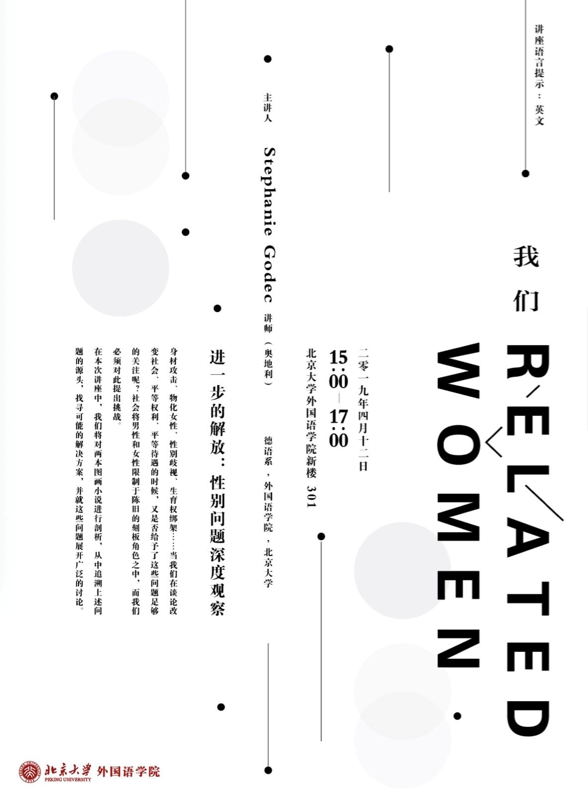 “我们-Wǒmen-Related”专题系列讲座由开云官方网址德语系外籍讲师Stephanie Godec发起和策划,从女性视角出发,关注不同群体中、不同角度下的女性问题。本系列讲座规划开展三场讲座及一场主题讨论活动。2019年4月12日下午,系列第一讲在外院新楼301会议室举行,本场讲座主题为《进一步的解放:性别问题深度观察》,由发起人Stephanie Godec主讲。