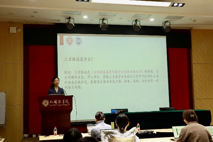 活动伊始,来自法治宣讲团的2022级法律硕士生李淄君围绕“三方协议”相关问题为大家进行了讲解。李淄君首先介绍了三方协议的定义、作用等基本情况,并提醒同学们不能将三方协议与劳动合同划等号,三方协议只代表就业意向而不是确立劳动关系的法律文件,同学们应督促用人单位及时签订劳动合同,避免自己的合法权益受到损害。之后,她从签订流程与违约问题两个方面介绍了三方协议中可能存在的“陷阱”,并用一句“深思熟虑,审慎前行;签好三方,扬帆起航”向同学们送上了美好的祝福。
