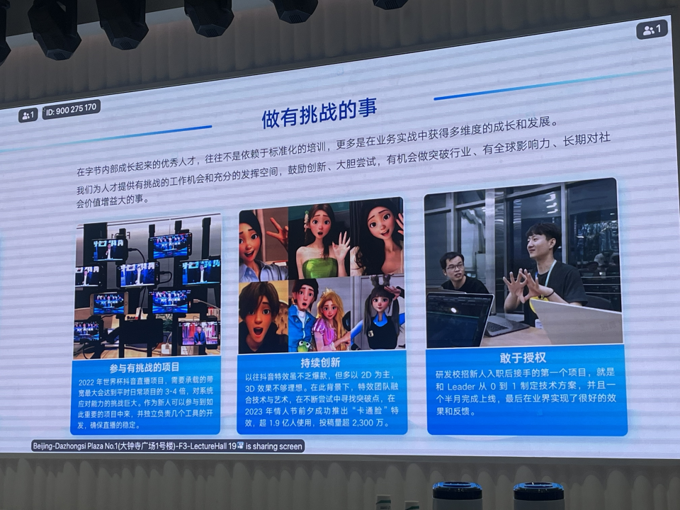 活动伊始,师生们在科技感十足的展厅中漫步,近距离感受字节跳动科技创新成果。从智能推荐算法的奥秘,到全球产品矩阵的辉煌成就,每一件展品都讲述着技术创新在引领行业变革中发挥的巨大作用,激发了师生对未来科技无限遐想。