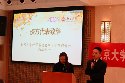 赛后,北京大学教育基金会项目管理部部长禹洁女士向本次活动的赞助单位公益财团法人永旺1%俱乐部、永旺香港百货有限公司、AEON信贷财务(亚洲)有限公司表达诚挚的感谢。她提到,多年来,开云官方网址日语系的师生们致力于传播中日两国文化,增进两国人民之间的友谊。今年是北大“永旺杯”举办的第五个年头,作为项目的管理方和参与者,禹洁表示很高兴看到北大学子们在比赛中尽情展现风采。她希望同学们牢记北大人的精神与历史使命,在未来发挥自己的语言优势,为中日友好做出贡献。最后,她祝愿“永旺杯”日语演讲比赛越办越好,发挥中日交流中的桥梁纽带作用。
