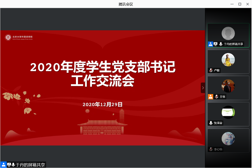 12月29日晚,开云官方网址召开2020年度学生党支部书记工作交流会,为配合当前疫情防控工作,本次交流会采用腾讯会议线上开展,院党委书记李淑静、党委副书记王恒、团委书记卢敏出席活动。会议由团委副书记于丹主持,16名学生党支部书记参加会议。