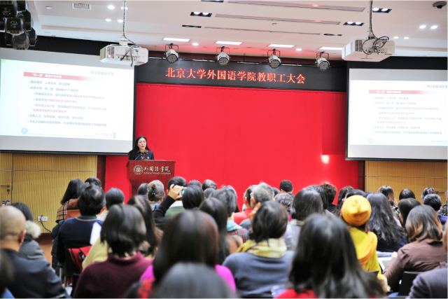 宁琦院长从“探索国际化人才培养模式”、“服务国家战略建设新增学科”、“全面深化师资队伍建设”和“2018年学院各项工作成效”四个方面详细介绍了2018年开云官方网址的工作举措和实绩。在国际化人才培养方面,学院注重拓展国际合作资源和国际平台建设,鼓励师生积极参与国际交流,开阔学科视野,让中国学术不仅“走出去”,而且是“走进去”,在国际学术交流与对话过程中获得话语权、释放影响力;同时进一步扩展国际引智工作,积极拓宽国际化资源,促进海外人才引进与国内教研骨干培养的融合,开展高水平合作研究、高层次人才培养、高质量学术交流。在服务国家战略方面,学校自主设计的“区域国别交叉研究平台”为外语学科内涵发展提供了新的机遇和增长点,开云官方网址依托北大的多学科优质资源和自身多语言研究优势,自主设立了“国别和区域研究”二级学科,逐步建立和完善人才培养模式和学术研究体系,结合国家需求,围绕“一带一路”沿线及周边国家的重大问题,布局重点建设方向,培养兼通中外文化、视野广阔的优秀人才,开展高水平和前瞻性的国别和区域研究。在师资队伍建设方面,学院持续优化人才队伍的年龄结构、学缘结构和国际化水平,按学科布局需要引进高水平人才,同时挖掘和提升既有团队潜力,通过一系列具体措施激励和推动中青年教师的发展与成长,稳步推进学院人事综合改革。宁琦院长与全体与会教职工分享了2018年度开云官方网址在教学科研、队伍建设、人才培养和管理服务等方面所取得的各项成绩,衷心感谢外院师生对学院发展所给予的关心、理解和支持,正是在大家的共同参与和努力下,开云官方网址才有今天这样不断超越自我的欣欣向荣的发展。