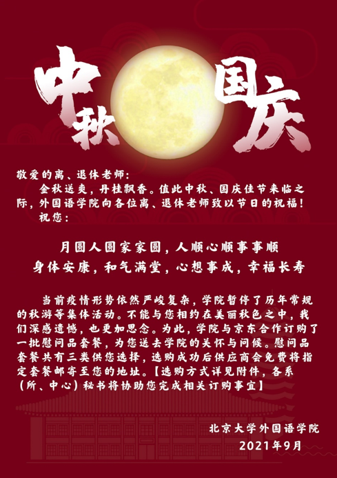 金秋送爽,丹桂飘香,又到了中秋、国庆佳节来临的美好季节,由于疫情形势依然严峻,今年学院仍无法举办线下集体活动,与离退休老师相聚在这美丽秋色之中。学院继续采取了线上寄送慰问品的方式,向各位离退休老师送去节日的祝福,传达来自学院的浓浓牵挂和关爱。