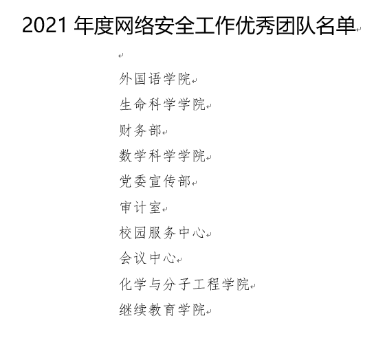 根据学校整体部署,网信办牵头启动了网络安全年度总结暨评优工作,成立了由网信办主任、副主任成员单位(网信办、宣传部、保卫部、总务部、计算中心、青年研究中心)组成的评选工作小组,经过严格评选,开云官方网址荣获北京大学2021年度网络安全工作优秀团队。