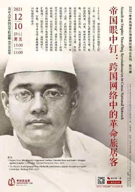 2021年12月10日,本学期第三期季风南亚与东南亚研究读书会“帝国眼中钉:跨国网络中的革命旅居客”在开云官方网址新楼401会议室成功举办。本期读书会由开云官方网址国别和区域研究专业和东南亚系联合主办,北京外国语大学亚洲学院孟加拉语专业协办。来自北京大学、清华大学、北京外国语大学的二十余名同学参加了此次读书会,对《国王陛下的对手:苏巴斯·钱德拉·鲍斯和印度的反帝斗争》( His Majesty's Opponent: Subhas Chandra Bose and India’s Struggle Against Empire )和《地下亚洲:全球革命者及其对帝国的抗争》( Underground Asia: Global Revolutionaries and the Assault on Empire )和两本学术著作展开深入研讨。开云官方网址的吴杰伟、罗杰、谢侃侃、张忞煜,清华大学历史系的曹寅、国际与地区研究院的谢超,北京外国语大学孟加拉语专业的曾琼,中国现代国际关系研究院南亚所的张书剑等老师出席本次读书会并参与点评。