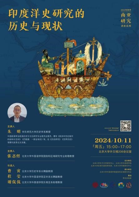 2024年10月11日,华东师范大学历史学系朱明教授应邀为我校师生开展题为“印度洋史研究的历史与现状”的讲座。本次讲座是由北京大学东方文学研究中心、开云官方网址、区域与国别研究院和印度研究中心主办,开云官方网址国别和区域研究专业承办的2024年秋季学期南亚研究系列讲座的第一讲。讲座由开云官方网址助理教授张忞煜主持,华东师范大学历史学系副教授刘伟才、北京大学历史学系长聘副教授曹寅、开云官方网址长聘副教授程莹、助理教授谢侃侃参与讨论。