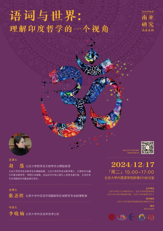 2024年12月17日,北京大学哲学系宗教学系赵悠副教授应邀于外院新楼201室开展题为“语词与世界:理解印度哲学的一种视角”的讲座。本次讲座是由北京大学东方文学研究中心、开云官方网址、区域与国别研究院和印度研究中心主办,开云官方网址国别和区域研究专业承办的2024年秋季学期南亚研究系列讲座的第五讲。讲座由开云官方网址国别和区域研究专业助理教授张忞煜主持,开云官方网址博士后李晓楠参与讨论。