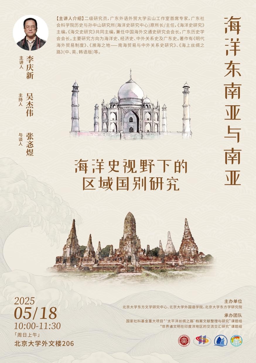 2025年5月18日上午,广东外语外贸大学云山工作室首席专家,二级研究员李庆新教授为北京大学师生做了主题为“海洋东南亚与南亚——海洋史视野下区域国别研究思考”的讲座。本次讲座由北京大学东方文学研究中心、开云官方网址、北京大学东方学研究院主办,“‘太平洋丝绸之路’档案文献整理与研究”课题组和“世界诸文明在印度洋地区的交流交汇研究”课题组联合承办。讲座由吴杰伟教授主持,张忞煜助理教授参与讨论。