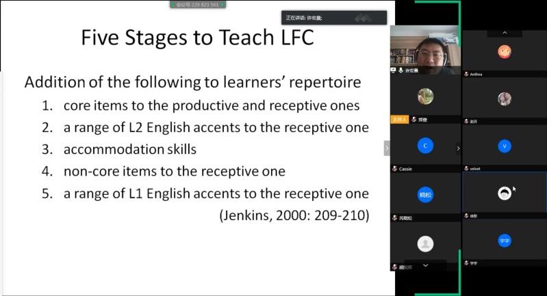 9日上午十点十分,讲座准时在腾讯会议室开始。许教授首先介绍了在讲英语的非母语语者(non-native speaker)已经远远多于母语者(native speaker)的当今,英语通用语(ELF)研究的重要性与现状。许教授从教什么(What)、为什么(Why)、如何教(How)和如何评价(How well)四个方面引入,对比了在后方法时代,英语通用语(ELF)背景下的英语教学与传统交际教学法的区别与联系,提出了适合中国学生的“英语通用语教学支柱”(ELF Teaching Pillars),包括内容、原理、方法和测评,并通过语音教学为例,对这四个方面进行了详细解释。