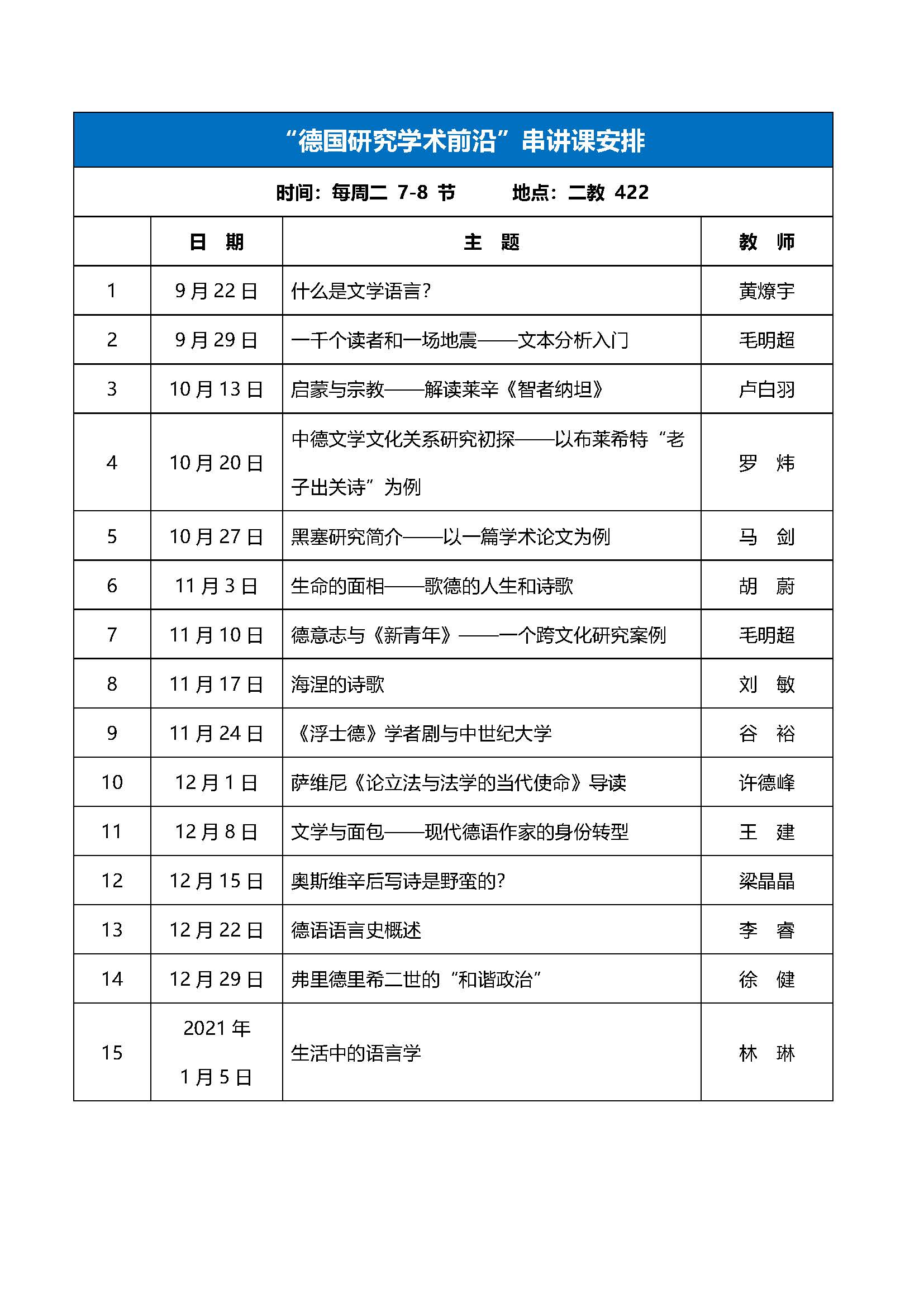 本学期讲座课程由德语系全体教员悉数登场,从个人研究专长出发,为同学们作相关报告;鉴于日耳曼学(Germanistik)学科创建伊始有历史、法学和文学三个方向,还专门邀请了北京大学历史系党委书记、德国史专家徐健教授讲授“弗里德里希二世的和谐政治”,法学院许德峰教授讲授德国法学家萨维尼的专著导读。(讲座题目附后)