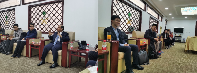 首先,艾勒马迪大使和师生代表团在使馆客厅内会谈。付志明老师首先代表师生感谢大使阁下的邀请,并表达了对中沙友谊的祝愿。随后,同学们就学习中遇到的困惑向大使踊跃提问。大使耐心地回答了同学们关于沙特2030愿景、石油问题、文化保护问题等热点话题的疑问,和大家展开互动。当提到中沙青年交流时,大使和在座的文化参赞热情洋溢地说起先前中沙青年交流的项目,并表示期待更密切的中沙青年交流。席间,大使用自己的个人经历和体会勉励同学们要不断思考、多问问题。王佩鸣、夏铁木还获得了大使赠书,两位同学表示将和大伙儿一起,在感兴趣的领域努力钻研、不断进步。