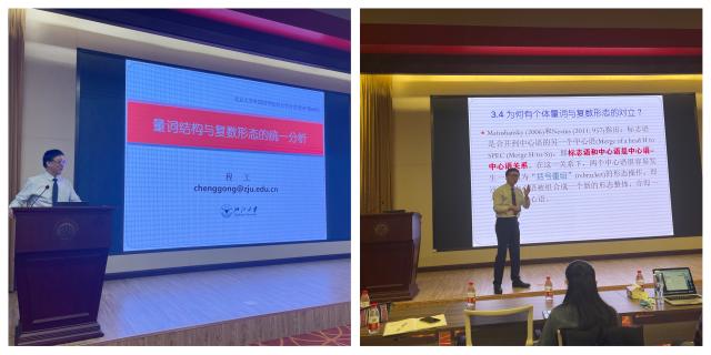 程工老师在讲座中主要分享了他对量词结构和复数形态进行统一分析的思考。程老师首先介绍了主流研究中名词性结构的两种分析路径,即以Chierchia为代表的词库分析路径和以Borer为代表的句法分析路径。程老师认为,句法路径更为经济也更为本质,其优势之一是将互补分布的复数形态和量词结构视为一个硬币的两面——表现不同,但功能相同,都是实现名词的个体化从而进行计数的方式。在句法路径的研究思路下,程老师从汉语的物质量词和个体量词两个类别出发,分别论证量词结构和复数形态一致存在的合理性。