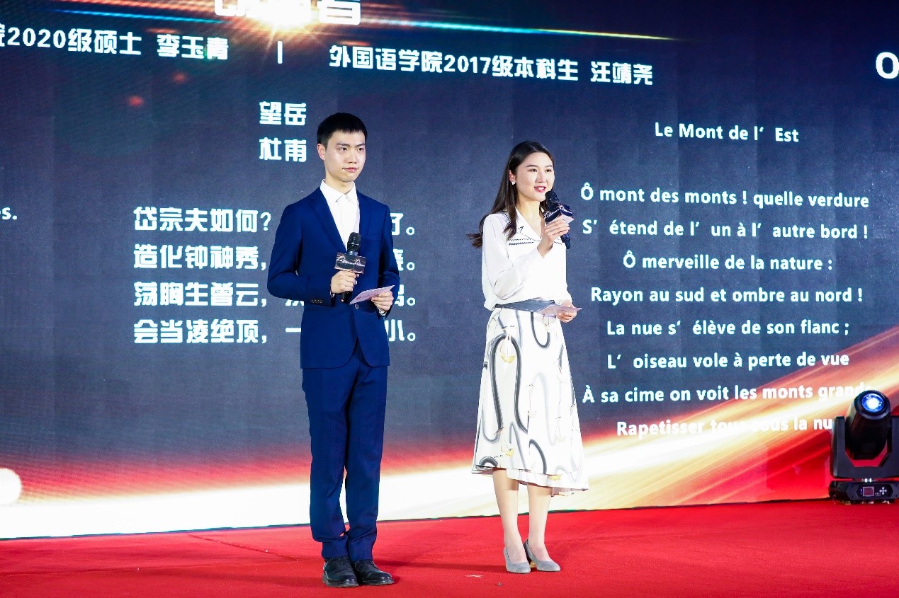 开云官方网址2020级英语翻译硕士李玉青、2017级法语系本科生汪靖尧现场朗诵许渊冲先生中译英、中译法诗歌代表作《别丢掉》《别董大》《望岳》,展示先生文辞优美、韵律工整、气势恢宏的翻译作品,代表广大学子向先生送上生日祝福。