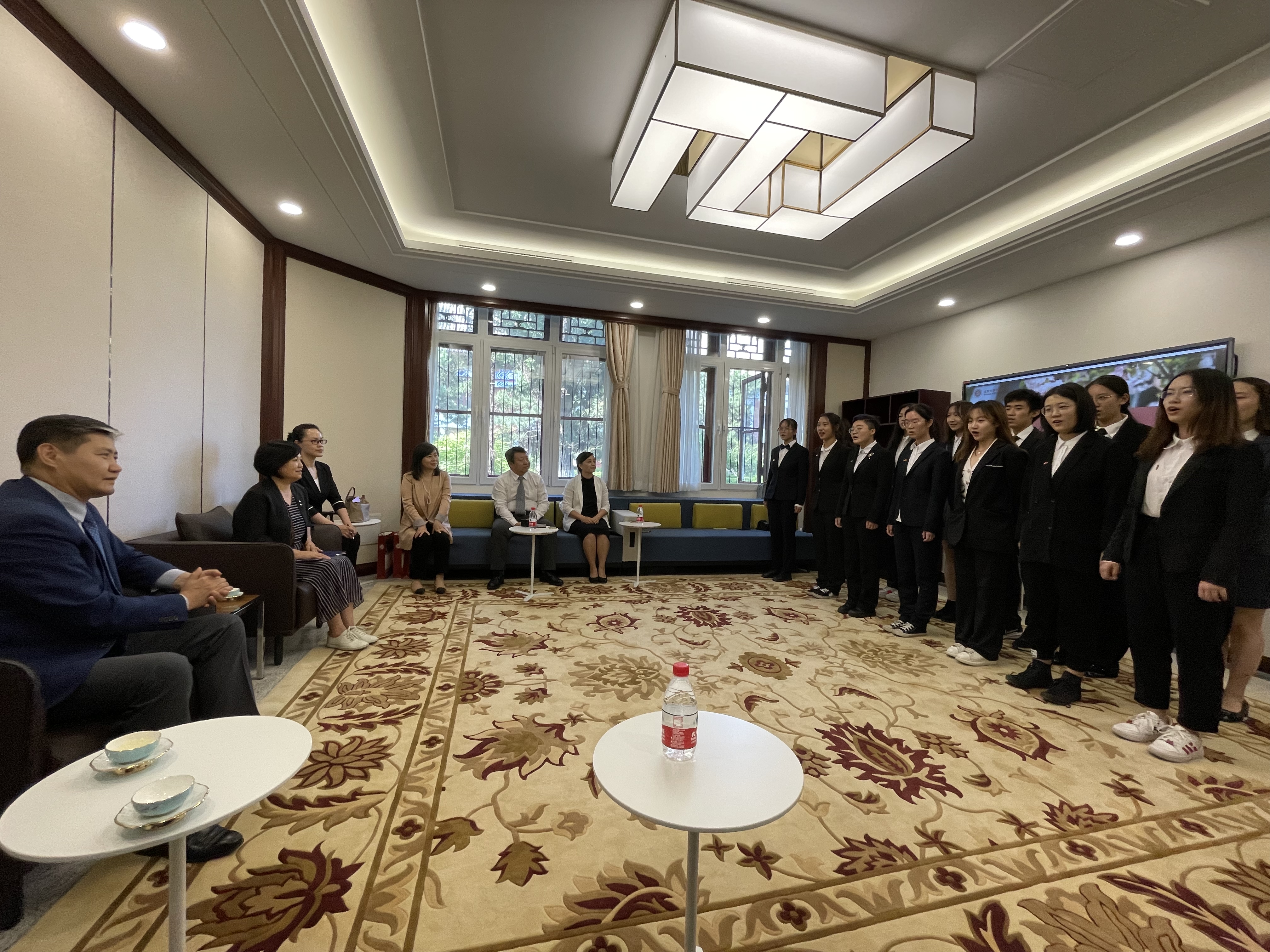蒙古语专业2020级本科生为巴德尔勒大使一行演唱了歌曲《乌兰巴托之夜》。巴德尔勒大使表示,他本人出生在乌兰巴托,《乌兰巴托之夜》是他年青时代的流行歌曲,学生们悠扬的歌声唤起了他对家乡、对青葱岁月的美好回忆。