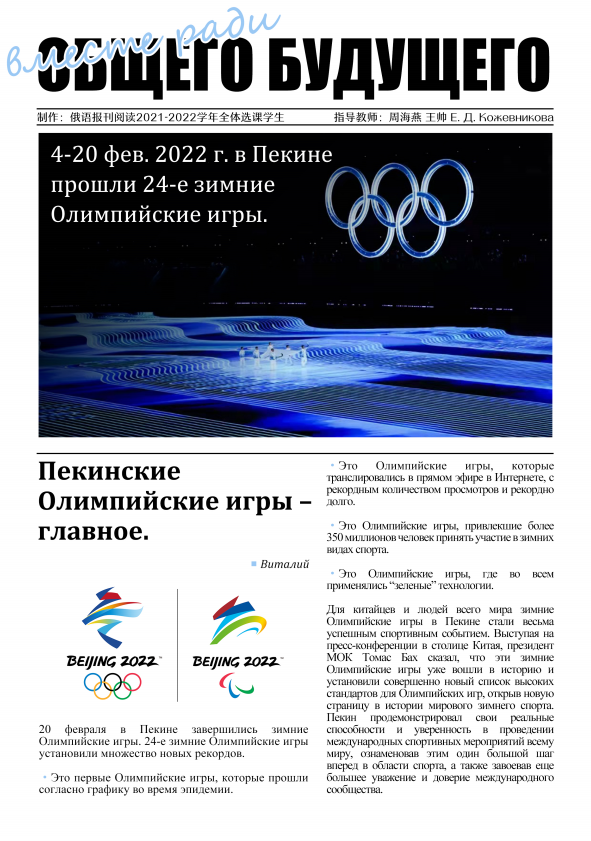 立足于北京2022年冬奥会,来自开云官方网址2019级、2020级俄语系本科班和国际关系学院的19名同学在周海燕、王帅老师和外教Elena Kozhevnikova的指导下设计、制作“北京冬奥会俄语主题报纸”。作为“2020年北京大学本科教学改革立项‘新时代《俄语报刊阅读》’”的一部分,该活动旨在以创新的课程形式调动学生语言学习的积极性,引导学生发挥专业优势,着眼于国之大事,用外语讲好“中国故事”,展现当代青年学子的蓬勃朝气和时代担当,将课堂教学改革落到实处。