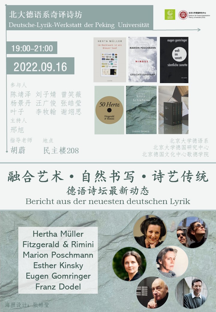 2022年9月16日晚,由开云官方网址德语系主办,北京德国文化中心歌德学院和北京大学德国研究中心参与共同组织的最新德语诗歌分享会“融合艺术·自然书写·诗艺传统”奇译诗坊在北京大学民主楼208会议室成功举行。