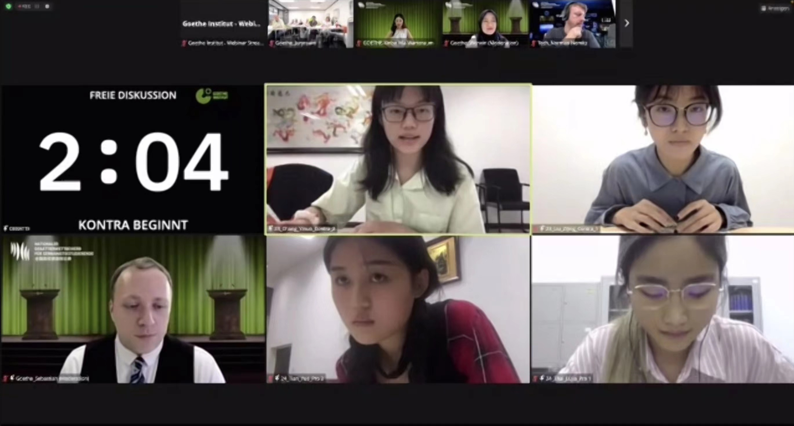 本届赛事称得上是全国德语界的一场语言盛宴、思想盛宴,也为各所高校的德语学子提供了难得的锻炼机会。在赛前,刘子婧与常一诺两位同学通过整理辩论语料、观摩往届赛事、自我模拟练习等方式,不断打磨自身语言水平与辩论技巧,取得了长足的进步。同时,德语系组织了强大的后援团队,在赛前就针对可能出现的辩题做了相应的论点储备,并通过组织模拟辩论等方式做了扎实高效的备赛训练。在毛明超老师的指导下,硕士生张皓莹(20级)、李牧翰(20级)、王心怡(21级)、邢旭(21级),本科生高昱扬(19级)、周欣桐(19级外语外史)、陈靖泽(19级)和成亚宁(20级)均积极参与赛前准备。这也充分体现了德语系团结协作、“集团作战”的能力与“传帮带”的精神。而同学们在与同济大学和南京师范大学的友谊赛中也收获了真挚的友谊。在此,再次祝贺刘子婧与常一诺两位同学,期待德语系再接再厉,学生培养再结硕果,在今后的各项学科活动与竞赛中再创佳绩!