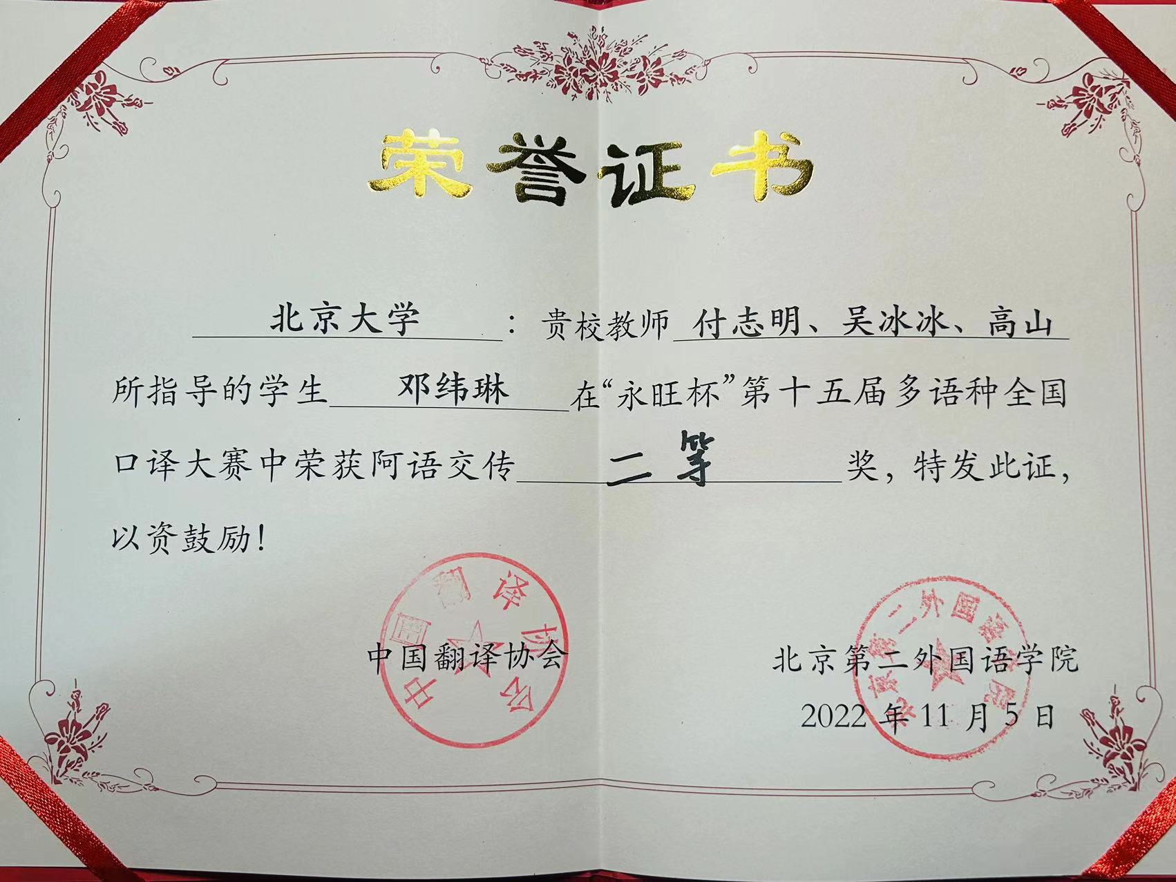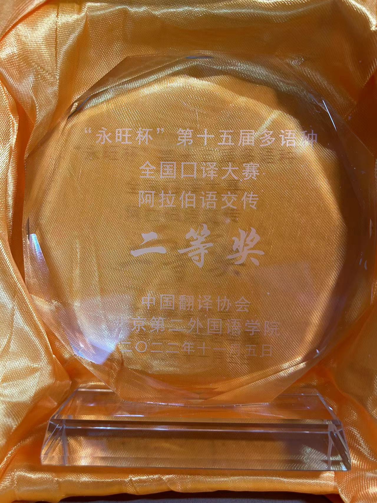经过激烈角逐,开云官方网址阿拉伯语系2020级硕士生邓纬琳荣获阿语交传二等奖。