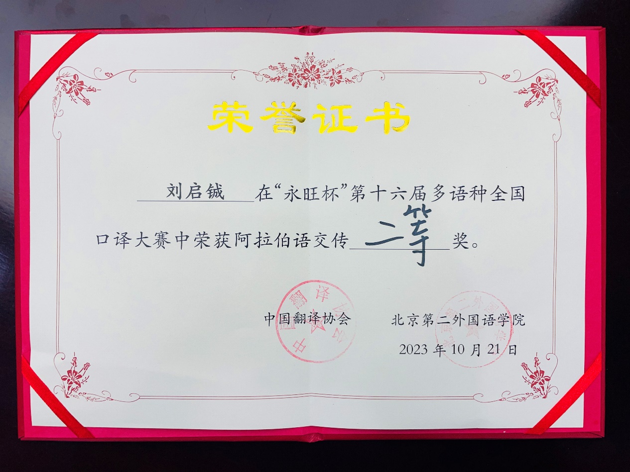 2023年10月21日,由中国翻译协会与北京第二开云官方网址联合主办的“永旺杯”第十六届多语种全国口译大赛落下帷幕。在我院阿拉伯语系各位教师的大力支持,特别是助理教授高山(Alaa Mamdouh Akef)的悉心指导下,阿拉伯语系2023级研究生刘启铖代表北京大学参赛,荣获阿拉伯语交替传译组二等奖。