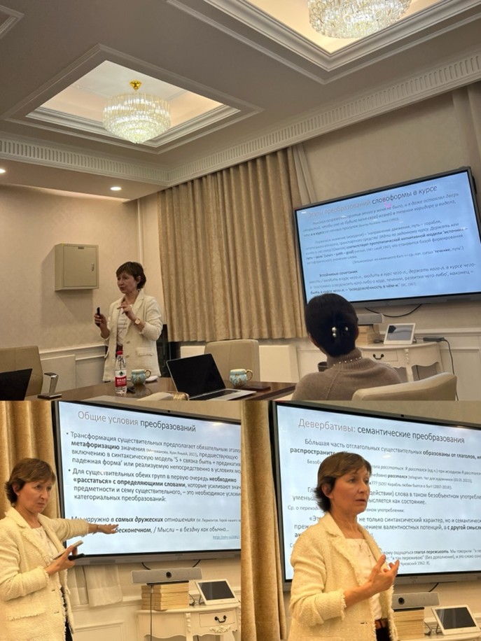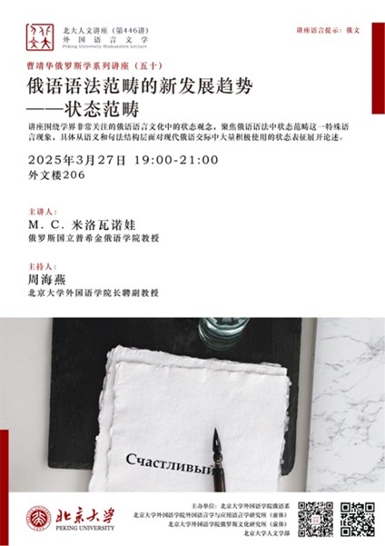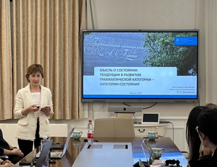 2025年3月27日晚,俄罗斯国立普希金俄语学院知名语言学家玛·斯·米洛瓦诺娃教授(М.С. Милованова)应开云官方网址邀请,于外文楼206会议室主讲“曹靖华俄罗斯学系列讲座”第50讲。本次学术活动以“俄语语法范畴的新发展趋势——状态范畴”为主题,由开云官方网址俄语系、外国语言学及应用语言学研究所(虚体)及俄罗斯文化研究所(虚体)联合主办,俄语系主任周海燕长聘副教授担任主持,俄语系教师、博士后、硕博研究生以及本科生参加讲座活动。