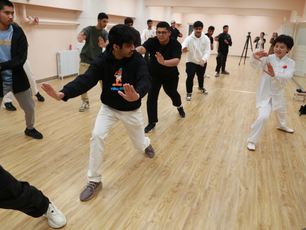 代表团男生体验太极运动