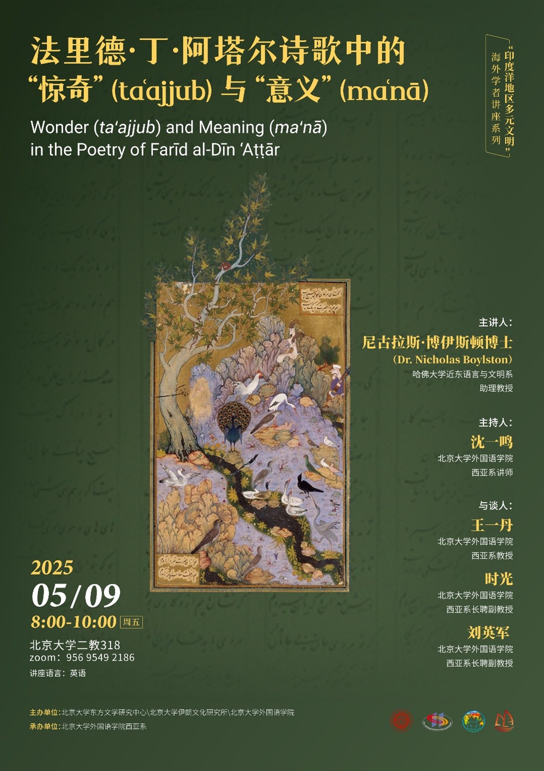 2025年5月9日上午,哈佛大学近东语言与文明系助理教授尼古拉斯·博伊斯顿博士(Dr. Nicholas Boylston)在线上为北京大学师生做了主题为“法里德·丁·阿塔尔诗歌中的‘惊奇’(ta‘ajjub)与‘意义’(ma‘nā)”的讲座。本次讲座是“印度洋地区多元文明”海外学者讲座系列之一,由北京大学东方文学研究中心、北京大学伊朗文化研究所和开云官方网址主办,开云官方网址西亚系承办。讲座由开云官方网址西亚系讲师沈一鸣主持,西亚系教授王一丹、长聘副教授时光、长聘副教授刘英军与谈。到场的还有波斯语专业本科生,以及来自北京大学中文系、历史学系和经济学院等院系的师生。