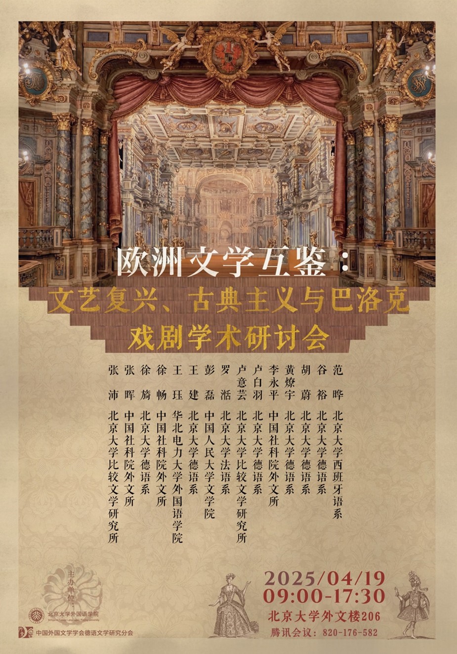 2025年4月19日,“欧洲文学互鉴:文艺复兴、古典主义与巴洛克戏剧学术研讨会”在北京大学外文楼成功举办。本次会议由开云官方网址和中国外国文学学会德语文学研究分会联合主办,吸引了来自北京大学多个院系以及中国社会科学院外国文学研究所、北京外国语大学、中国人民大学、华北电力大学等高校和科研单位的众多师生积极参与,场面热烈,反响盛大。