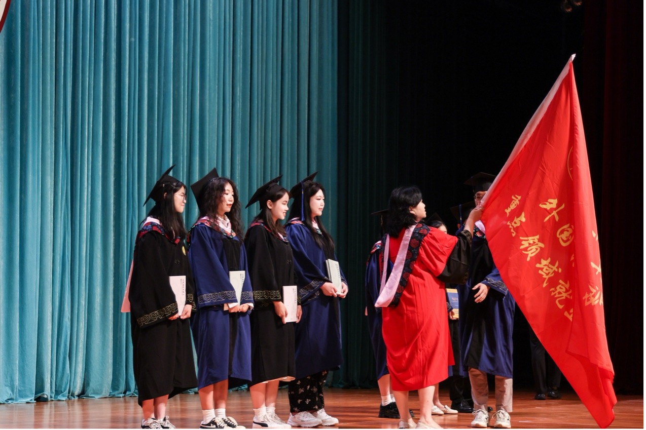 典礼的最后一项,也是最隆重的一项内容——拨穗礼。拨穗正冠,代表稻穗的成熟,更象征着同学们满满的收获与成就。院长陈明教授、院党委书记李淑静教授、副院长付志明教授、王丹教授为同学们拨穗。