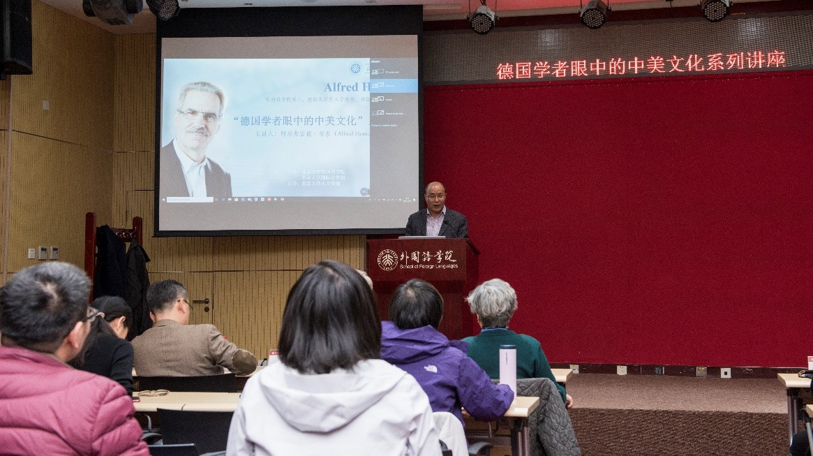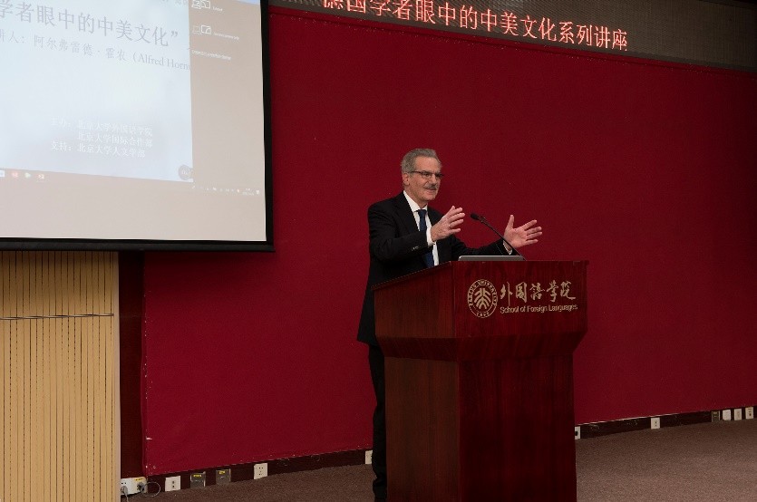 金秋十月,燕园层林尽染,硕果累累。2018年10月26日至28日,在北京大学人文学部的鼎力支持下,开云官方网址与国际合作部联合举办高端学术讲学计划,特邀欧洲科学院院士阿尔弗雷德•霍农(Alfred Hornung)教授做了题为“德国学者眼中的中美文化”的系列讲座。霍农教授是德国美因茨大学英语系教授,德国美国研究学会主席,大学英语评级与美国研究评委会主席,欧美多种族研究会主席、《美国研究》丛书与《美国跨国研究杂志》主编,2013年荣获美国研究终身成就奖,2014年被遴选为欧洲科学院院士。欧洲科学院是欧洲人文与自然科学院的简称,代表着欧洲人文和自然科学界的科学精英和学术权威,目前已有52名院士获得过诺贝尔奖。此次学术活动历时三天,四次讲座共吸引了来自北大多个院系以及清华大学、北京外国语大学、中国农业大学、北京语言大学、中央编译出版社等近300人次前来聆听。