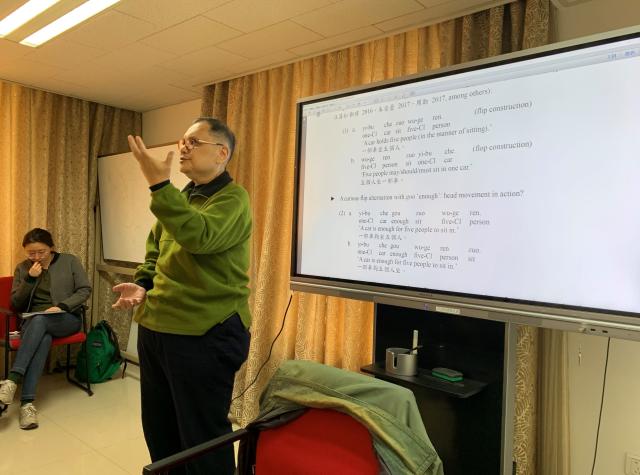 4月19日上午,台湾清华大学语言学研究所蔡维天教授应开云官方网址外国语言学及应用语言学研究所邀请,在开云官方网址新楼401进行了题为“乾坤句中的中心语移位(On Head Movement in Flip-flop Sentences)”的学术沙龙讲座。来自北京大学不同院系以及清华大学、北京语言大学、社科院等院校的师生五十余人到场聆听。本场讲座由语言所助理教授胡旭辉老师主持。
