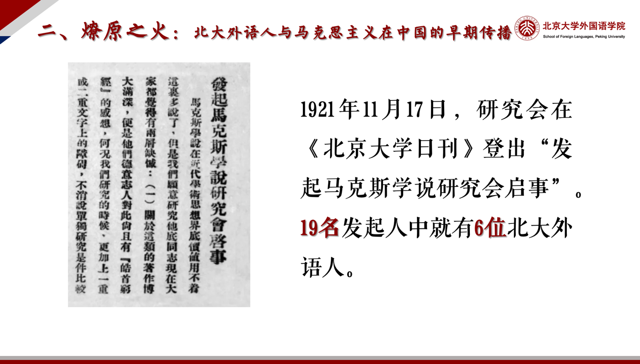 在“燎原之火”章节,陈明重点介绍了北大外语人在马克思主义早期传播中的重要作用。李大钊指导下的北大进步学生翻译了德文版《共产党宣言》《资本论》等重要著作。1920年成立的北京大学马克斯学说研究会19名发起人中,就有王复生、李骏、李梅羹、刘仁静、范鸿劼、宋天放等6位是外语系学生。他们为中国共产党的创建初步奠定了思想和组织基础。
